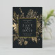 Our Autumn Meadow wedding save the date frames your wedding details with an elegant square border of dried watercolor foliage in muted shades of beige, tan and sepia, with real gold foil trim on a rich charcoal background. A modern and elegant take on the botanical trend.