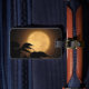 Make your luggage stand out on an airport carousel with unique tag designs! It's autumn, and a luminous golden yellow full moon has risen behind the black silhouettes of leaves blowing in the breeze on this dramatic fine art photography luggage tag. The background is illuminated in tones of orange, gold and brown to create an abstract pattern in an Asian motif. The reverse has a brown background for your customisable personal information.