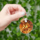 This decorative keychain features a geometric abstract pattern of five sided pentagon shaped mosaic tiles in brilliant autumn colours of red, orange, brown, yellow, gold, blue, grey, black and white.