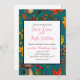 Autumn mushrooms, leaves, nuts and berries on blue invitation