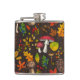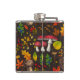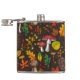 Autumn mushrooms, leaves, nuts and berries on dark hip flask