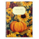 A vibrant autumn-themed spiral notebook featuring a large orange pumpkin surrounded by golden sunflowers and deep burgundy leaves. The rich, seasonal colours of yellow, orange, and dark green create a warm and festive fall aesthetic. A cream label in the centre reads "Composition Notebook," making it both decorative and practical for journalling, school, or seasonal notes.