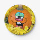 Funny face painted on orange pumpkin in yellow mum flowers for fall party.