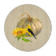 Unique and rustic Autumn harvest design features watercolor illustration of a sunflower, yellow finch and pumpkin on sand and white polka dot background.