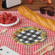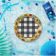This design features sunflowers and pumpkins that encircle the outside edge of the plate. The black and white buffalo plaid background create a rustic, french country flair.