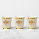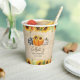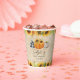This design features three adorable pumpkins in orange, black and white plaid, and leopard print on a burlap print. Sunflowers and pumpkins encircle the edges of the cup on the top and bottom. The expectant mum's name in a handwritten cursive typography is featured along with "Baby Sprinkle" and the date.