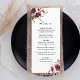This wedding menu features watercolor flower bouquets of dahlias, garden roses, and peony in burgundy red, maroon, blush pink over fall leaves. For more advanced customisation of this design, please click the BLUE DESIGN TOOL BUTTON. Matching items are also available.