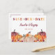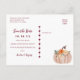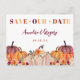 Autumn Save Our Date Announcement Postcard with fall florals and pumpkins in russet brown, tangerine orange, deep merlot, burgundy, and winter cream tones.
