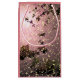 A pretty pink, white, yellow, green and black art design of sunlight reflected on water and falling autumn leaves.