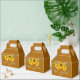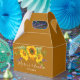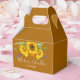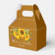 Pretty Autumn/ Fall wedding favour box features watercolor sunflower bouquet on golden brown background with white customisable text blocks in modern fonts