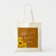 Pretty Autumn/ Fall wedding tote bag features watercolor sunflower bouquet on golden brown background with white customisable text blocks in modern fonts