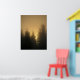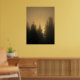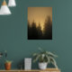 A misty morning in early September, a golden sunrise illuminating the backdrop of spruce trees in shadow.