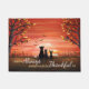There is Always Something to be Thankful for. Inspirational and motivational saying/quote. Two dogs and cat silhouette watching the sunset on an autumn evening. Bright, vivid orange fall colours. With two trees on both sides with falling autumn leaves and birds flying towards the sunset. Fall scenery with slogan. Original Acrylic Painting Art done by Donna Leger for Irony Designs. All Rights Reserved.