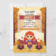 Around her, the invitation bursts with delightful hand-drawn details that represent the spirit of Thanksgiving. A cute turkey with wide, colourful feathers stands proudly, exuding warmth and fun while inviting guests to join the celebration. The cheerful turkey adds a touch of whimsy that young children will find irresistible. Scattered pumpkins and rich autumn leaves in vibrant oranges, deep reds, and warm yellows frame the scene, creating a cosy backdrop that feels like a page from a storybook.