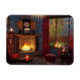 A cosy reading corner on a rainy autumn day. Around the hearth with a blazing fire are cushy red armchairs, with stacks of books and teacakes and a teapot to complete the comfort. Outside a yellow willow and red maple and beech hedge are obscured by the blowing rain, which sprinkles the window where a ginger cat sits looking out.