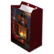 A cosy reading corner on a rainy autumn day. Around the hearth with a blazing fire are cushy red armchairs, with stacks of books and teacakes and a teapot to complete the comfort. Outside a yellow willow and red maple and beech hedge are obscured by the blowing rain, which sprinkles the window where a ginger cat sits looking out.