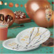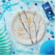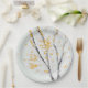 A fresh look for fall parties. Light airy colours balance the thick paint daubs and heavy texture in this painterly design printed on paper plates featuring a nearly bare autumn tree releasing the last of its yellow leaves to the crisp mint wind. Breeze by our shop for more seasonal moments and matching party decor.  ♡ Idyllfire