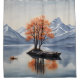 Two small trees in orange autumn foliage sits on a rocky island in the middle of a lake in the mountains on this beautiful shower curtain.