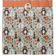 This unique and colourful shower curtain features images of boho style woodland animals, trees, mushrooms, leaves and even acorns! Animals include a brown bear, a red squirrel, an owl, and a hedgehog. Colours include tan, teal blue, orange and brown. At the top is a matching orange border with a circle banner at the centre. Inside the circle banner is an image of a fox.