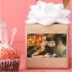 This fantasy design depicts a fairy clad in autumn leaves set against a fantasy forest background. She is extending her hand up to a pretty blue butterfly.
