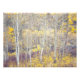 A photograph captures a dense grove of aspen trees in their autumnal glory. The trees stand tall with white bark and bare branches, their leaves a vibrant yellow, creating a striking contrast against the muted grey and brown of the forest floor. The sunlight filters through the canopy, casting a warm glow on the scene.