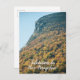 A photograph of Cannon Mountain in the fall. The trees' leaves have turned from green to shades of orange and yellow. These colours blanket the mountain, reaching near the top. The profile of the mountain is the remains of the granite stone, where a prominent face used to be, as he waited and watched for his love to return to him. This fall day has a clear, light-blue sky as the background of the scene. In a white font is a greeting, "Salutations du New Hampshire!" Image Copyright ©2024 Kimberly J Tilley. zazzle.com/store/developingnature