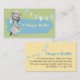 This baby shower diaper raffle card matches the baby shower items shown below. The front side has a grey aviator wolf holding a green aeroplane, wearing a green and blue striped scarf and a vintage era aviator's hat with goggles. There are bunting flags across the right corner with a green background and a blue swipe of colour to show off the yellow "Diaper Raffle" text. The backside is in yellow with more bunting flags and customisable