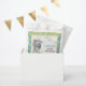 These super cute baby shower favour bags have a striped pattern in green and blue with a light grey text box trimmed in yellow. On the left side, there is a grey wolf holding a green aeroplane and a big blue balloon. The wolf has a green and blue striped scarf and a blue vintage-type aviator's hat with brown eye goggles. There are also some corner bunting flags in the upper right corner in green, blue, and yellow patterns. The customisable text says, "Ashleigh's Baby Shower" on it in blue and grey lettering with the date also printed in green below and a large "Thank You!" in blue cursive at the bottom. If you require assistance or would like any other matching items, please email your request to niteowlstudio@gmail.com and watch your spam folder for my reply. Thank you!