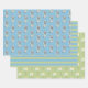 These three sheets of wrapping paper coordinate with the baby shower collection below. One sheet has a blue background with a pattern of an adorable grey wolf holding a green aeroplane. The wolf has a green and blue striped scarf and a blue vintage-type aviator's hat with brown eye goggles. The second sheet has a green background with blue stripes on it and the third sheet in the set has a green background with a pattern of three yellow, blue, and green balloons. If you need anything else, please email niteowlstudio@gmail.com and watch your spam/junk folder for my reply.