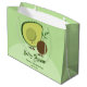 Large Gift bag for a baby shower with smiling avocado and avocado pit cartoon characters. The two happy characters are part of a green design with customisable words. This item is part of a baby shower party collection that includes an invitation, napkins, and more. Customise these items, add them to your cart, and have a happy baby shower!