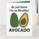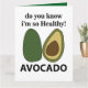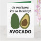 Avocado Do You Know I'm So Healthy Avocado Card original design by Nisha Prabhu. Celebrate health and wellness with a fun twist! This vibrant greeting card features a charming avocado character that’s bursting with personality and promoting a wholesome lifestyle. Whether you're sending birthday wishes, a cheerful note to a friend, or just a little encouragement, this card is perfect for anyone who appreciates good vibes and good nutrition. With its playful design and uplifting message, it’s ideal for health enthusiasts, foodies, or anyone who loves avocados! Spread the joy of healthy eating and let your loved ones know that being nutritious can be fun! Perfect for any occasion, this card is a tasty addition to your collection.