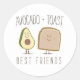 A sticker featuring a cartoon illustration of an avocado and a piece of toast with faces. Text says "Avocado + Toast Best Friends."