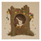 A cute illustration of a beagle in a hollow tree covered in colorful leaves