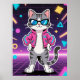 A stylish cartoon cat strikes a confident pose in a neon-lit, retro arcade world. Rocking a hot-pink bomber jacket and cool blue shades, this feline is the embodiment of 80s nostalgia and futuristic flair. With pixel shapes and neon beams glowing in the background, the cat radiates pure confidence and playful swagger.