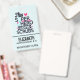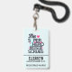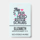 Name badge with a cute and awesome saying. Typography text says: This superhero wears scrubs. Designed with a light blue stethescope and a big pink heart and a pink heart monitor line. A light blue background with faded pink polka dots.