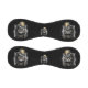 A fierce looking dark gray and black pussy cat wearing a leather hat with steampunk brass on it. A bronze feather tops the cock-eyed hat. This beautiful feline is wearing a golden or amber lensed monocle giving one eye a bronze tone, Around the cats neck hangs a brass trinket of some kind adding to the overall Steampunk attire.