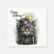 A fierce looking dark gray and black pussy cat wearing a leather hat with steampunk brass on it. A bronze feather tops the cock-eyed hat. This beautiful feline is wearing a golden or amber lensed monocle giving one eye a bronze tone, Around the cats neck hangs a brass trinket of some kind adding to the overall Steampunk attire.