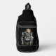 A fierce looking dark gray and black pussy cat wearing a leather hat with steampunk brass on it. A bronze feather tops the cock-eyed hat. This beautiful feline is wearing a golden or amber lensed monocle giving one eye a bronze tone, Around the cats neck hangs a brass trinket of some kind adding to the overall Steampunk attire.