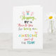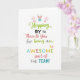 This greeting card features a bright thank-you message arranged vertically on a white background, with a friendly, upbeat look. Near the top, two soft pink hand coverings frame a blue egg with white dots, and tall bunny ears rise above it for a sweet spring touch 🐰. Just beneath that, the phrase “Hopping BY” appears in green, flowing lettering, leaning slightly as if it’s bouncing into the page. The word “AWESOME” sits larger in the middle, with each letter in a different color like green, coral, yellow, and turquoise, giving it a cheerful rhythm. The spacing feels open and airy, letting the colors stand out while keeping everything easy to read. Lower down, a small yellow writing tool angles beside the text, adding a hint of shared work and friendly support. A pink speckled egg rests near the bottom like a small seasonal accent 🌷. The overall layout stays centered, with the colorful words stacked neatly and the little spring icons tucked at the top and bottom.