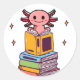 Bookworm Axolotl is enjoying reading and sitting on a pile of books.