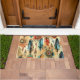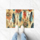Aztec boho native American watercolor tribal design of turquoise blue feathers, abstract red sunflowers and geometric shapes on a desert sand background.