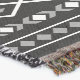 Aztec influenced shapes and line pattern in grey and white detail on a black background.