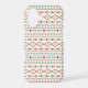 Aztec influenced shapes and line pattern in rust/terracotta color teal color detail on a cream color background.