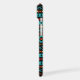 Aztec influenced and stylized mixed motifs pattern in teal, red, dark red and yellow on black.