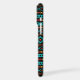Aztec influenced and stylized mixed motifs pattern in teal, red, dark red and yellow on black.