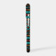 Aztec influenced and stylized mixed motifs pattern in teal, red, dark red and yellow on black.