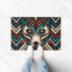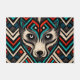 This is a decorative wolf face made by hand and stylised with Aztec patterns in black, red, turquoise and beige colours.