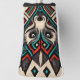 This is a decorative wolf face made by hand and stylised with Aztec patterns in black, red, turquoise and beige colours.