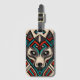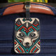 This is a decorative wolf face made by hand and stylised with Aztec patterns in black, red, turquoise and beige colours.