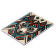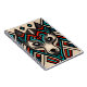 This is a decorative wolf face made by hand and stylised with Aztec patterns in black, red, turquoise and beige colours.